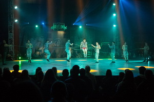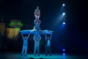 Wenig später arbeiten drei Truppenmitglieder eine erstklassige und trickstarke Ikarier-Nummer. Ein Doppelsalto sowie ein Salto, der auf einer hochgereckten Hand eines Fängers sicher gelandet wird sind die Top-Tricks dieses Auftritts.