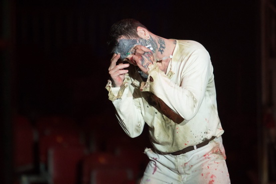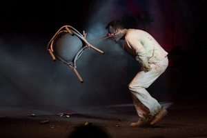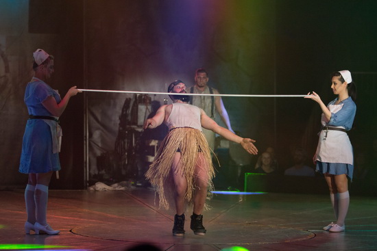 Zwei Wärter zerren „Brian Ernest“ auf die Bühne und nachdem er auf des „Professore“ Anweisung mit Anstaltskleidung – einer offen gelassenen Zwangsjacke – ausgerüstet wurde, legt er los. Milano Kaiser ist die Rolle des irren Clowns auf den Leib geschrieben. In herzerfrischender Direktheit, mit großer Spielfreude und Spontanität gibt er den August und versteht es ausgezeichnet mit Improvisationstalent auf seine Mitspieler und Situationen einzugehen. Bei unserem Besuch trifft es „Mike“. Der freundliche junge Mann wird im Handumdrehen zum Mitspieler, der mit angelegtem Halsband und Leine einen Hund imitieren muss und nach Domina-Art bestraft wird. Dann geht es ans Messerbrett und auch diese Prüfung stand er „wie ein Mann“ durch.