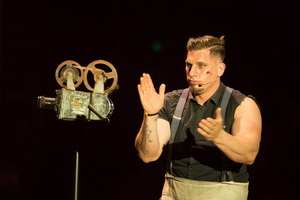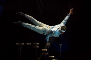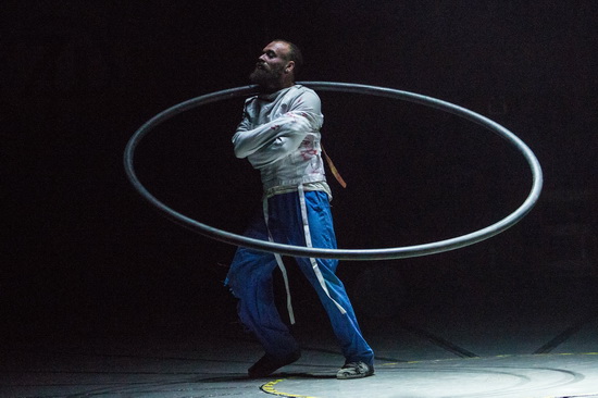Ungewöhnlich ist die Darbietung am Cyr-Rad von Johnny Castaletti gestaltet. Der Artist steckt mit auf den Rücken gefesselten Händen in einer Zwangsjacke und setzt das auf der Bühne liegende Requisit nur mittels seiner Füße in Bewegung. Er lässt es auf der Bühne und auch in Art eines Hula Hoop Ringes um seinen Oberkörper und Hals kreisen. Nachdemdie Fesseln von einer Besucherin gelöst wurden, wirbelt Castaletti in bekannter Manier temporeich spektakuläre Balancen ausführend über die Bühne.