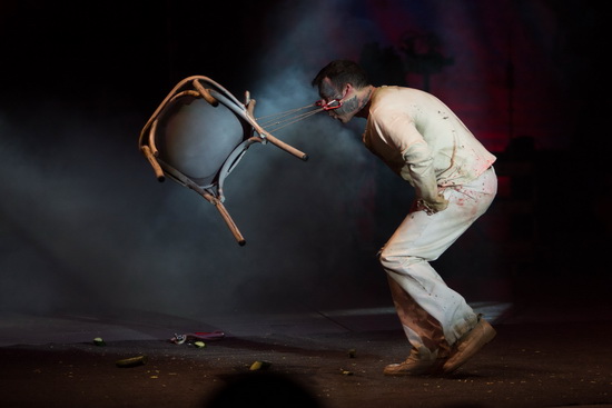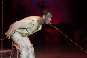 Im zweiten Auftritt zieht er einen Rollhocker, mit einem erwachsenen Mann darauf, über die Bühne. Das besondere daran? Der Hocker hängt an einem dünnen Stahlseil, das mittels eines Fleischerhakens an der Zunge des Freaks eingehakt ist.