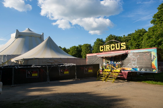 Das weiß-hellgelb gestreifte Chapiteau mit der hohen achteckigen Kuppel und passendem Vorzelt leuchtet zwischen dem hellen grün der Bäume in der Abendsonne hervor. Die weißen Materialauflieger und Wohnwagen der Artisten sind dicht darum gruppiert. Ein hoher Zaun mit schwarzen Spannbändern, die das Logo des Circus zeigen, schirmt das Gelände gegen neugierige Blicke ab. Auch der große Kassenauflieger ist mit den schwarzen Spannbändern an die Gruseloptik des Unternehmens angepasst.