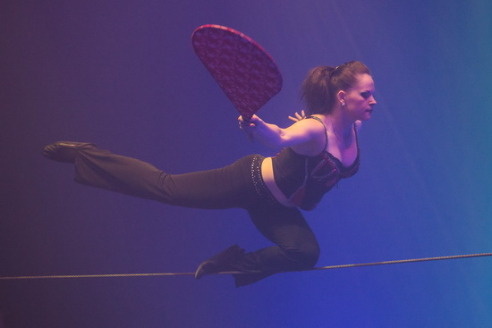 Reni Toth tanzt auf dem Seil. Routiniert werden die Schritte und Sprünge ausgeführt. Spagat und andere Balancefiguren ergänzen die Trickfolge. Im zweiten Programmteil erleben wir die versierte Artistin an den Strapatentüchern. Auch in diesem Auftritt arbeitet sie viele gängige Abläufe des Genres.