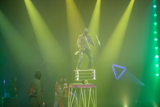 Fahles Licht und monoton hämmernder Singsang aus den Boxen bereiten die Zuschauer auf das Kommende vor. Eine erhöhte Bühne bietet an Stelle einer Manege für alle Zuschauer beste Sicht. Die Gruselgestalten bevölkern während des Einlasses, sehr zum Schrecken manch eines Besuchers auch das Chapiteau, sie wandern auch unter dem Gradin umher und mit einem schnellen Griff an Waden und Fesseln der über ihnen Sitzenden erzeugen sie eine enorme Wirkung.