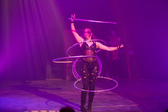 Temperamentvoll geht Miss Gina bei ihrer Hula-Hoop Show zu Werke. In vielfältigen Variationen lässt sie die Reifen um Arme und Körper kreisen. Immer wieder wandern die rotierenden Ringe an ihrem Körper hinauf und hinab. Zum Höhepunkt der Darbietung kreisen ca. zwanzig aufgefangene Hula-Hoops um ihre Hüften.