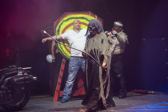 Zu all den gruseligen und dunklen Szenen der Show gehören als Kontrapunkt auch einige heitere Momente. Den ersten gestaltet Clown Alfredo, der auf einem schweren Bike auf die Bühne rauscht. Nachdem er mit einer (Wasser)-Maschinenpistole die von Zuschauern hochgehaltenen Luftballon abgeschossen hat, tritt er als Messerwerfer in Erscheinung. Der ans Brett gefesselte junge Mann aus dem Publikum darf sich zunächst noch den finsteren Sensenmann der an ihm vorüber zieht betrachten, ehe ihm die Augen verbunden werden und Alfredo in Aktion tritt.