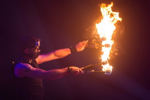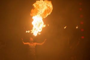 Im weiteren Verlauf des Abends präsentiert sich Stephan Riedesel mit einer effektvollen Feuer-Show. Fackeln werden serienweise im Mund gelöscht. Lange im Mund gehaltene Flammen entfachen die Fackeln erneut. Abschließend stößt er meterhohe Feuersäulen kraftvoll bis weit in die Kuppel aus.