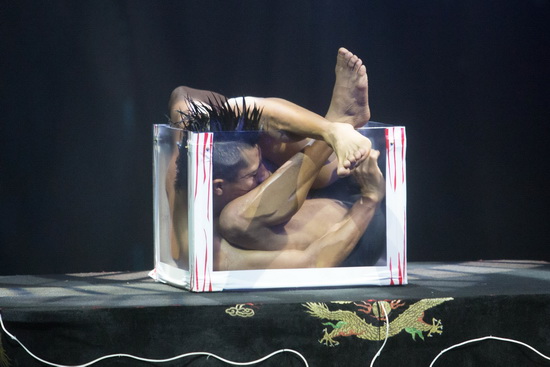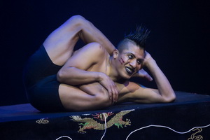 Marco Biasini, er hat das vorzügliche Lichtdesign der Show geschaffen, tritt als versierter Jongleur vor sein Publikum. Im schummrigen Licht blau wabernder Nebel manipuliert er geschickt und sicher seine orange fluoreszierenden Requisiten. Bälle, Ringe und Keulen zeichnen ihre leuchtende Spur in den Dunst und mit einer effektvollen Fackeljonglage findet der gelungene Auftritt seinen Abschluss.