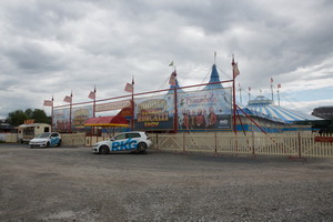 Eine handvoll Roncalli-Wagen sind neben einer Anzahl Container, die als Garderoben, Kantine und Sanitärräume dienen, hinter dem Spielzelt zu finden. Wohnwagen sind kaum vorhanden, da die Mitarbeiter und Artisten zumeist in Hotels logieren.