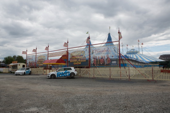 Eines der typischen Roncalli-Chapiteau wurde mit einem optisch passenden, quadratischen Vorzelt kombiniert. Hier finden der prachtvolle Roncalli-Verkaufswagen der Restauration und ein großer Souvenirstand der Band ihren Platz.