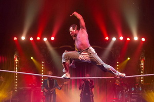 Nach dem kurzen Opening, dass das komplette Artisten-Ensemble tanzend auf der Bühne vereint, arbeitet Jose Henry Caycedo auf dem Elastikseil. Der kolumbianische Artist, im Habit eines Elfen, bietet eine Reihe hoher Sprünge und Saltos auf dem labilen Grund. Darüber hinaus ist er im Verlauf der Show immer wieder in die Auftritte seiner Kollegen eingebunden.