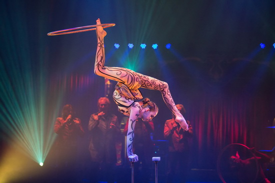 Alena Ershova begeistert mit einer außergewöhnlichen Kombination von Handstandequilibristik und Hula Hoop. Ein riesiger oranger Seestern liegt auf der Bühne und langsam schält sich die junge Russin aus diesem Kostüm. Die ersten Handstandfiguren erfolgen auf der Bühne, dann erreicht sie Handstäbe und setzt ihre umfassende, perfekt vorgetragene und anspruchsvolle Trickfolge fort. Während sie im Handstand steht, nimmt sie mit einem Fuß einen Hula Hoop Reifen auf und lässt diesen rotieren. Beim abschließenden Einarmer sind es gar drei Ringe, die um Füße und Hand rotieren.