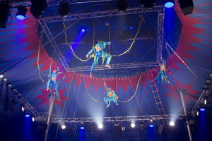 Die letzte Darbietung des Abends gestalten vier Mitglieder von „Sol de Cuba“ hoch in der Kuppel an Bungees. An einem quadratischen Gestell sind die Gummibänder befestigt und erlauben weite Flüge der im fahlen blauen Licht und dichtem Bühnennebel schemenhaft wirkenden Artisten.