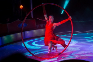 Gina Sibila ist die „Lady in red“, die in und auf ihrem roten Cyr-Rad brilliert. In einem flüssigen und eleganten Ablauf rollt die junge Frau mit ihrem Requisit, dabei stets gekonnt die Balance haltend, in weiten und engen Kreisen durch die Manege und lässt viele kräftezehrende Figuren spielerisch leicht wirken.
