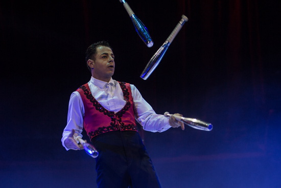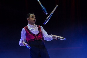 Im zweiten Teil der formidablen Show jongliert Anthony Daniel im Torero-Look mit Devil Sticks, Keulen, Tennisbällen die final in Gürtelsäckchen landen und Fackeln. Die vielseitigen Routinen erfolgen ausnahmslos mit hoher Präzision und Sicherheit.
