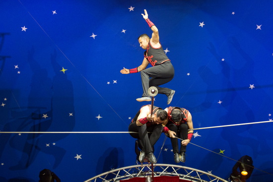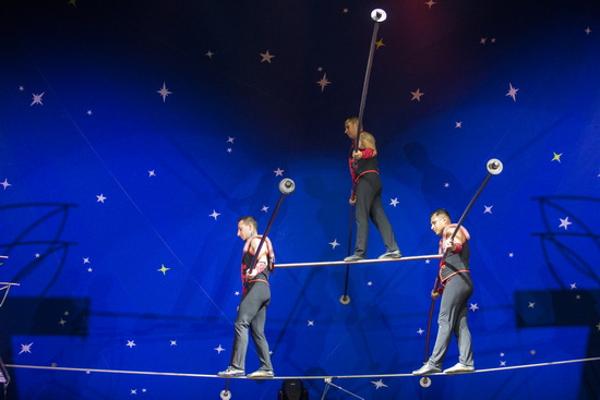 Der finale Act sieht die drei Herren der Truppe auf dem Hochseil. Auf- und Abgang über das Schrägseil, Sprung über einen und zwei Partner sind zu Beginn der Darbietung zu sehen. Seil springen und der Lauf im Zwei-Mann-hoch mit Absprung auf das Seil gehören neben anderen Elementen zum Repertoire. Die abschließende, souverän ausgeführte Dreier-Pyramide beschließt den furiosen Auftritt in idealer Weise.