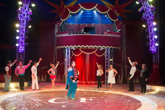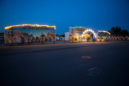 Ein blaues Viermasten-Chapiteau mit weißen und roten Absetzungen ist als Spielzelt aufgebaut. Sterne auf den Mastspitzen, der Schriftzug „Circus“ über dem First und Girlanden an den Abseglungen leuchten in der Dunkelheit im Schein unzähliger Lichter.
