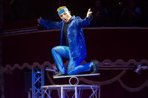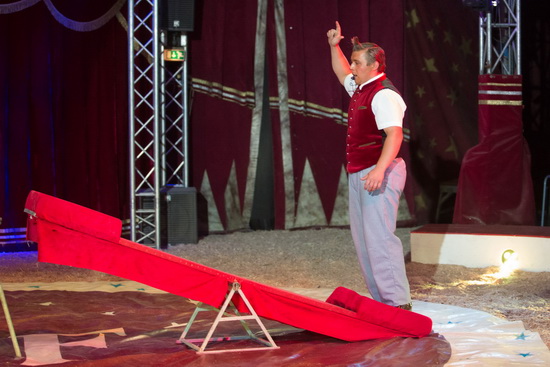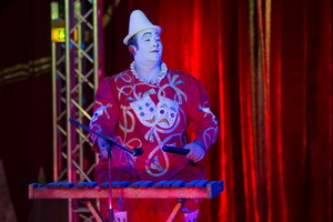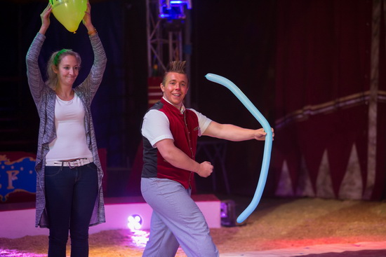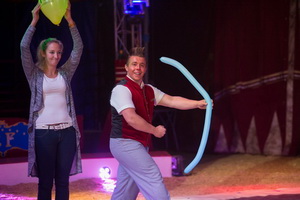 Clown Joschi setzt bei seinen, mit komödiantischem Können gespielten Reprisen auf Interaktion mit dem Publikum. Temporeich, ohne Längen und pointiert dargeboten erfreuen sie gleichermaßen Groß und Klein. Zunächst werden Logenbesucher, die mit schwungvollem Wurf einen Hula Hoop Ring über dem ausgestreckten Fuß des Clowns platzieren konnten, mit dem Lolli belohnt. Bei seinem Schleuderbrett-Act benötigt der Clown die Hilfe eines Zuschauers – leider ist das Requisit dem Tun der beiden Akteure nicht gewachsen. Im zweiten Programmteil erleben wir Joschi zusammen mit einer jungen Frau aus dem Publikum als Kunstschützen. Es gilt mittels „Pfeil und Bogen“ einen Ballon zu treffen. Nachdem etliche Objekte im turbulenten Treiben vorzeitig zerstört wurden oder abhanden kamen, gelingt schließlich doch der goldene Schuss.