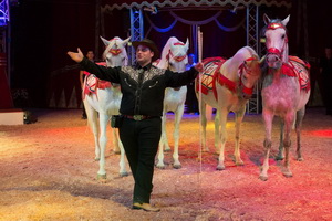 Weiter geht es mit einem Vierer-Zug Araberhengste unter der gekonnten Peitschenführung von Gino Frank. Die Darbietung im Western-Look, der Dresseur tritt im Cowboy-Kostüm auf und die Pferdegeschirre zeigen ein indianisches Design, bietet eine große Anzahl unterschiedlicher Lauffiguren, die flott und souverän geboten werden. Im zweiten Teil des Auftritts kommt ein dekorativ gescheckter Hengst hinzu, der Variationsmöglichkeiten der Figuren noch einmal erweitert. Verschiedene erstklassig ausgeführte Da Capo Steiger bilden den effektvollen Höhepunkt der Darbietung.