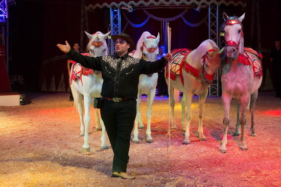 Die Programmfolge beginnt mit Pferdedressuren. Zunächst präsentiert Sandra Frank einen weißen Araberhengst, der das tiefe durchstecken des Kopfes zwischen den auf einem Podest ruhenden Vorderhufen vollendet beherrscht.