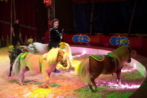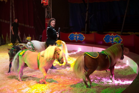 Sandra Frank präsentiert, mit Assistenz des etwa neunjährigen „Stallmeister“ Lucio, einen munteren Sechser-Zug Shetland-Ponys. Die Minipferde beherrschen ein breites Repertoire verschiedener Figuren, das die versierte Dresseurin souverän ausführen lässt. Als Da Capo betätigt sich ein quirliger Terrier als Jockeyreiter. Viele Auf- und Absprünge auf das galoppierende Pony werden mit Feuereifer ausgeführt. Weite und hohe Sprünge über die Gerte der Vorführerin erfolgen mit Bravour.