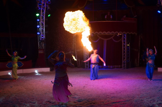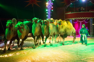 Ein großes orientalisches Schaubild bildet den idealen Rahmen für die Kameldressur von Gino Frank und die Fakir-Show von Benny Frank. Zunächst umrunden die Kamele in ruhiger Gangart die Manege in der drei Haremsdamen tanzen und Gino Frank den Song "Arabische Nächte" aus Disneys Aladdin singt. Benny Frank steht barfuß auf den Säbeln eines leiterartigen Gestells und stößt enorme Feuersäulen in Richtung Zeltkuppel aus seinem Mund. Untermalt wird die Szene vom Live-Gesang Gin Franks. Dann lässt dieser seine sechs Kamele ihr erlerntes Können zeigen. Abschließend zeigen zwei Lamas ihr großes Sprungvermögen und setzen über die abliegenden Kamele hinweg.