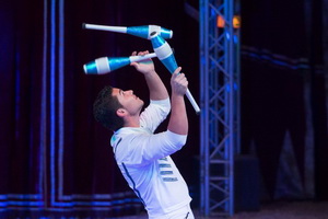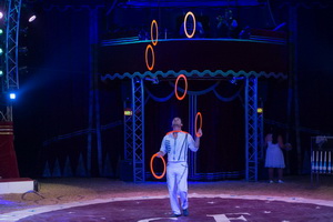 Tempojongleur Michael Sulc arbeitet die letzte Darbietung der Show. Die ersten Touren werden mit kleinen Bällen ausgeführt. Es folgen Routinen mit fünf und sieben leuchtenden orangenen Ringen. Viele unterschiedliche Muster zeichnen die virtuos gehandhabten Keulen, von denen bis zu sieben sicher jongliert werden, in die Luft. Zum Höhepunkt seines Auftritts jongliert Michael Sulc gekonnt neun Ringe.