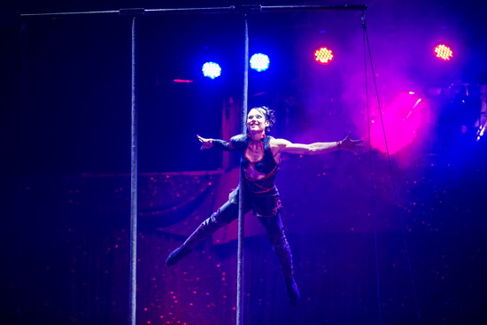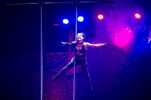Aurelie Brua begeistert auch das Publikum des Karlsruher Weihnachtscircus mit ihrer außergewöhnlich kraftvollen Arbeit am Doppelmast. Die zierliche junge Frau arbeitet eine unglaubliche Anzahl kraftraubendster Tricks in exzellenter Ausführung. Scheinbar ohne Anstrengung hält sie lange die Positionen, die mit fließenden eleganten Bewegungen verbunden werden. Während der gesamten umfangreichen Trickfolge setzt die Artistin kein einziges Mal einen Fuß auf den Boden, sondern verharrt ausschließlich am Requisit.