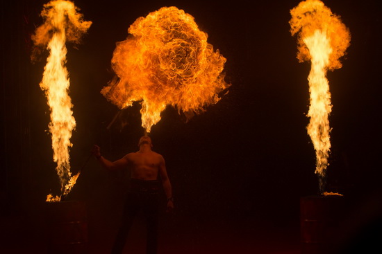 Zwei Mal erleben wir „Los Alamos“ mit ihren herausragenden Darbietungen im Verlauf der Show. Einen spektakulären Auftritt bieten Patrick und Henry Brumbach mit ihrer Feuershow. Meter hohe Flammen schießen aus dem Mund der Artisten und aus Benzinfässern in die Kuppel. Zahlreiche Fackeln werden mit dem Mund gelöscht, die Flamme im Mund lange gehalten und anschließend die Fackeln wieder entzündet. Eine abgefeuerte Kanonenkugel fängt Patrick Brumbach in einem hell lodernden Metallgestell auf und mit brennenden Bola-Schnüren werden effektvolle Funkenregen erzeugt. Zu Beginn des zweiten Programmteil sehen wir Los Alamos, nun ist Ehefrau Ramona die Partnerin, mit ihrer einzigartigen Messerwurfdarbietung. In hohem Tempo erfolgen die Würfe, die extrem dicht an die Partnerin platziert werden. Blindwürfe mit Morgensternen, Rückhandwürfe und auf in der Hand gehaltene Zielscheiben sind weitere höchst selten zu sehende Elemente. Die temporeiche, leistungsstarke und spektakulär gestaltete Nummer findet mit den Würfen auf die sich schnell drehende Scheibe, mit der Partnerin in der Mitte, ihren Abschluss.