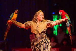 Das Duo Shmarlovski präsentiert seine Papageien-Show zu Klängen aus „Fluch der Karibik“. Kleine Papageien aus der Familie der Agaporniden zeigen eine Reihe verschiedener Tricks, so z. B. durchfliegen einen Ring, tummeln sich auf einer Wippe und einer Rutsche. Ihnen folgen prächtige Aras, die in allererster Linie mit ihren Flugeinlagen beeindrucken.