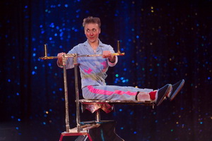 In einem zweiten Auftritt präsentiert er auf eindrucksvolle Weise seine außergewöhnliche Beweglichkeit. Auf einem metallenen Drehgestell sitzend verdreht er Beine und Unterkörper um einhundertachtzig Grad nach hinten und verharrt lange in dieser Position. Schnell ausgeführte Drehschwünge führen weit über diesen Punkt hinaus und ermöglichen beinahe eine komplette Körperumdrehung.