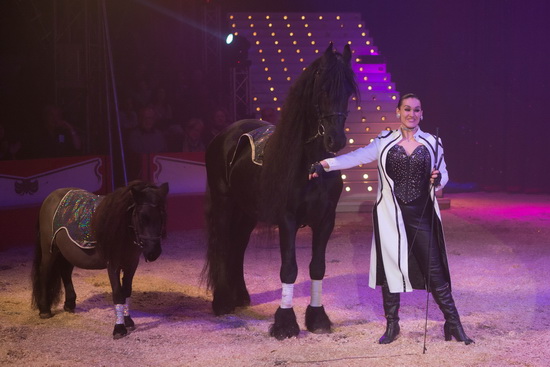 Franziska Micheletty-Folco eröffnet die Nummernfolge mit einem munteren Groß-Mittel-Klein. Ein Friesenhengst, ein schwarzes Shetland Pony und ein ebensolches Fallabella Pony laufen eine Reihe der genretypischen Figuren.