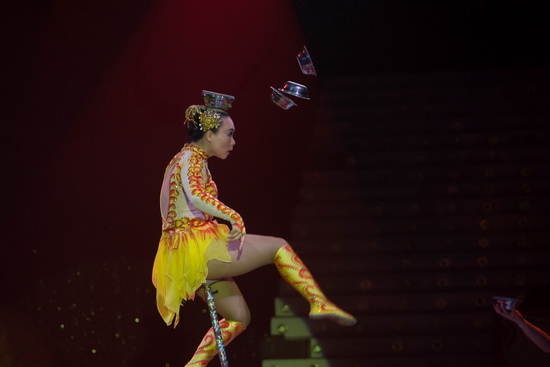 Eine erstklassige Balance auf dem Hochrad bietet die chinesische Artistin He Yuan. Sie steuert das Rad mit einem Fuß und kickt mit dem anderen bis zu vier Metallschälchen zu gleich hoch und fängt sie sicher in einem Gefäß auf ihrem Kopf. Dann geht es mit dem Hochrad, Longen gesichert, auf eine große Kugel, die gegen seitliches wegrollen gesichert in einer geformten Matte liegt. Nun werden wieder Gegenstände hoch gekickt und sicher auf dem Kopf gefangen.