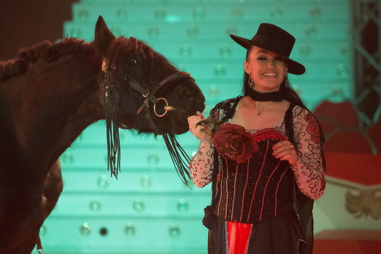 Wenig später präsentiert die Tierlehrerin eine Pferdefreiheit mit vier Friesen. Im Gipsy-Look leitet die versierte Vorführerin die verschiedenen Aktionen der Hengste. Als Da Capo prescht ein feuriger weißer Araberhengst in den roten Ring und bietet einige Steiger.