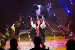 Auch die dritte Dressurdarbietung der Show sieht Franziska Micheletty-Folco als Vorführerin. Zu Beginn des zweiten Programmteils bringt sie sieben Ziegen und zwei Hunde in die Manege. Die Ziegen laufen u.a. über einen Balken, bauen eine Pyramide und springen von einem zum anderen Podest, während die Hunde auf einer Rolle laufen und diverse Sprünge zeigen.