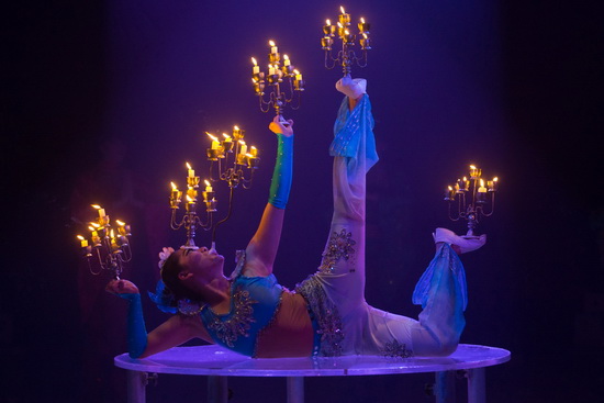 „Schlangenmädchen“ Zhao Ling beginnt ihre Evolutionen mit verschiedenen Kontorsionen, die ihre enorme Beweglichkeit nachdrücklich unter Beweis stellen. Im zweiten Teil ihres Auftritts balanciert sie fünf mehrarmige Leuchter mit brennenden Kerzen auf Händen, Füßen und Mundstab, während sie ihren Körper in extremer Weise biegt.
