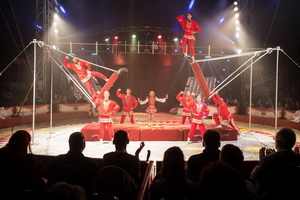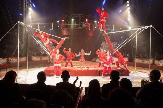 Der finale Auftritt gehört der Truppe Filinov an der doppelten Russischen Schaukel. Die acht ArtistenIn fliegen hoch und weit durch die Kuppel und landen mit enormer Präszision auf dem gegenüber stehenden Requisit. Viele verschiedene Sprungkombinationen werden sicher ausgeführt und mit einer Passage zweier Voltigeure erreicht die Darbietung ihren Höhepunkt.