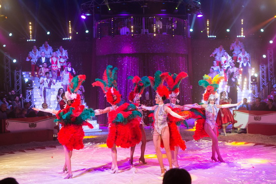 Dekorative rot-weiße Logen und ein großes Gradin mit Einzelklappsitzen füllen den Raum um die Manege. Der hohe Artisteneingang aus glitzerndem roten Stoff wird von zwei hohen beleuchteten Showtreppen flankiert und trägt obenauf einen towerartigen Aufbau, der dem exzellent aufspielenden Orchester Platz bietet.