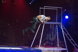 Brad Santos Garcia verzichtet in seinem komischen Act am Trampolin darauf einen Betrunkenen zu mimen und der, oftmals zusammenhanglos eingebaute Striptease unterbleibt gleichfalls. Er gerät als Requisiteur "versehentlich" auf das Trampolin und bei seinem Auftritt steht, neben gekonnten Kaskaden am Sprungturm, die Trampolinakrobatik im Vordergrund.
