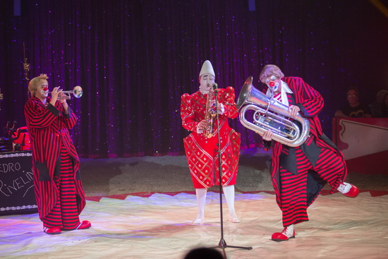 Die Rivelinos Clowns erobern mit viel Musik den roten Ring. In ihrem Entrée steht eine Boxschule im Mittelpunkt des Geschehens und mit viel Klamauk begeistern sie die kleinen Besucher, die bei Kampf der Auguste gegen einen Punching Ball lebhaft mitgehen.