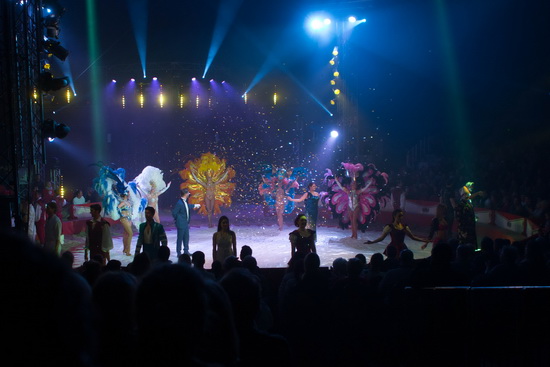 „Lido de Paris“ in Karlsruhe – mit phantastischen Kostümen mit pompösen Federschmuck zaubert das Ballett diese Atmosphäre in die den roten Ring um leitet das große Finale ein. Die beiden Manegensprecher stellen die Mitwirkenden vor und im Konfettiregen werden sie vom zufriedengestellten Publikum mit viel Beifall gefeiert.
