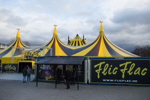 Für diese Edition wurde vollkommen neues Zeltmaterial in Betrieb genommen. Chapiteau, Vorzelt und Garderobenzelt glänzen natürlich in dem für FlicFlac typischen Streifendekor. Nur einige Fahrzeuge sind um die Zelte platziert und die den hohen Metallzaun zierenden Spannbänder mit Artistenportraits mussten an diesem Tag auf Grund des sehr stürmischen Wind eingerollt bleiben. An einem Portal aus Gitterohrträgern sind über dem Eingangstunnel die Leuchtschriften des Circusnamens und des Festivals angebracht.