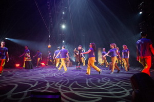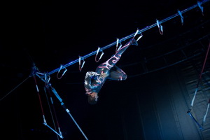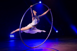 Im zweiten Teil der Show erleben wir Valérie Inertie mit ihrer Kür am Cyr Rad. Ihr ungeheuer kraftvoll Auftritt lässt sie eins werden mit dem Requisit und in einem furiosen Wirbel erfolgt ihr Tanz mit und in dem Metallreif.