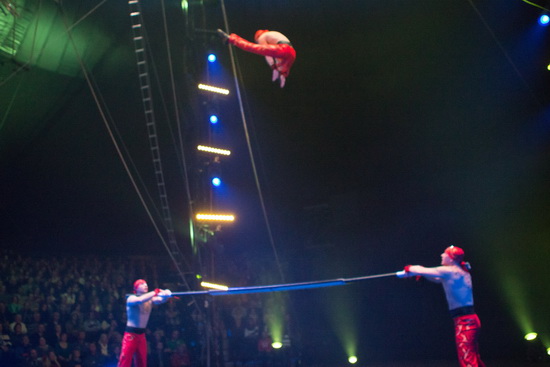Gleich die erste Darbietung, der Stangenwurf des Trio Yarmoshko war eines der Festival- Highlights, wie überhaupt der erste Programmteil von leistungs- und ausdrucksstarken Nummern geprägt war. Mit selten zu sehender Eleganz und Perfektion erfolgen die vielseitigen Tricks auf der Fiberglasstange. Sämtliche Saltos und Pirouetten werden sehr hoch und erstklassig ausgeführt sowie perfekt gestanden. Der Schwierigkeitsgrad steigert sich von Trick zu Trick und mit einem hervorragenden dreifachen Salto erreicht der Auftritt seinen Höhepunkt.