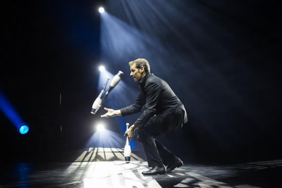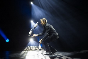 Den Reigen der tempogeladenen, mitreißenden Darbietungen des ersten Programmteils setzt Jongleur Claudius Specht fort. Mit ungeheurer Präzision absolviert der schweizer Gentleman die verschiedensten Routinen. Er beginnt den Auftritt mit einer temporeichen Keulenjonglage. Einzigartig, sind nach unserer Meinung, Metallbecher als Requisiten, mit denen die unterschiedlichsten Wurfmuster und Kaskaden ausgeführt werden. Eine wahre Augenweide für den technisch Interessierten ist der roboterartige, selbstfahrende und "Keulen werfende" Requisitenbehälter. Abschließend wechselt der Jongleur noch einmal zu den Keulen, hierbei zeigt er uns auch was Geschwindigkeit beim drehen derselben bedeutet. Schließlich werden sieben Keulen in einem perfekten Wirbel in der Luft gehalten.