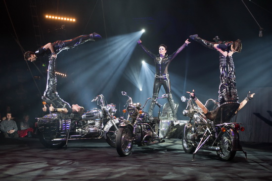 Die Kuskovs präsentieren ihre Ikarischen Spiele auf zwei Choppern und einem Trike. Die schweren, chromblitzenden Bikes machen mächtig Eindruck und die stilecht in schwarzem Lack und Leder auftretenden Artisten geben die coolen Rocker. Die beiden jugendlichen Flieger wirbeln sicher auf den Füssen ihrer Porteure und der größere der beiden zeigt seine Figuren auch auf dem langsam dahinrollenden Trike.