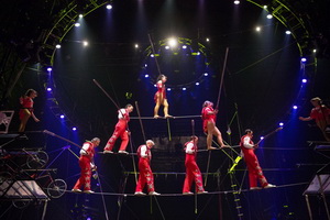 Die Wallenda Family setzt mit ihrer Arbeit auf dem Hochseil den Schlusspunkt in der Show. Nachdem ein Sicherheitsnetz über die vorderen mittleren Sitzreihen gespannt ist, das relativ kurze Hochseil ist zwischen den beiden vorderen Masten installiert, besteigen zunächst vier Wallenda-Damen das Seil und zeigen den Stand auf einem Bein anschließend folgt eine Dreierpyramide mit Kopfstand. Eine weitere Dreierpyramide, nun auf Fahrrädern und mit dem Sitz auf einem Stuhl auf der Spitze, ist ein weiterer Trick der sehr statisch wirkenden und langsam ablaufenden Darbietung. Die legendäre Siebener-Pyramide komplettiert die Darbietung. Bedächtig erfolgt der Aufbau der fragilen Formation die nach wenigen Schritten sicher die gegenüberliegende Plattform erreicht.