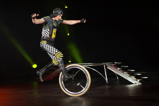 Duo Racers nennen sich der ukrainische Einradartist Victor Gorodetskyy und seine Partnerin Julia. Temporeich und trickstark wird die ganze Bandbreite anspruchsvoller Einradartistik geboten. Auf einem Einrad werden Treppenstufen springend überwunden und Seil gesprungen. Quer zur Fahrtrichtung sitzend bewegt der Artist das Rad mit den Füßen auf dem Reifen laufend vorwärts. Von Alexander Zhukanov vor vielen Jahren in einer der ersten FlicFlac-Produktionen populär gemacht, erleben wir hier nach langer Zeit wieder einmal Tricks auf einem weiterentwickelten „Pur-Rad“. Ohne Sattel, nur auf den Pedalen stehend, bietet Gorodetskyy vielfältige Abläufe, die in Sprüngen von einem zum anderen Rad während der Fahrt gipfeln. Abschließend zeigt er sein großes Balancevermögen, wenn er zusammen mit seiner Partnerin auf einem hohen Stangenrad die Bühne umrundet.