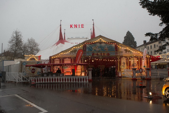 In St. Gallen gastiert der Circus auf dem innerstädtischen Spelterini Platz. Das Gelände inmitten der Bebauung kann nur die wesentlichen Teile des Circus aufnehmen. Außer dem großen weißen Vier-Masten Chapiteau finden nur wenige Wagen – Garderoben, Generatorwagen und weitere technische Ausstattung - Platz. Das kleine, dreiseitig offene Vorzelt mit dem hohen, bunt bemalten Giebel und die Container der Circusrestauration nehmen den restlichen Raum ein. Der moderne Kassenwagen und die dekorative Maringotte haben gegenüber dem Haupteingang ihren Platz.