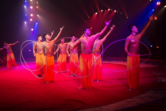 Mit einer Lasso-Nummer sind die Mitglieder der Xinjiang Troupe gleich zu Programmbeginn zu sehen. Dreizehn Artisten zeigen vielfältige Abläufe mit den Seilschlingen, springen Saltos und Flickflack durch die rotierenden Lassos.