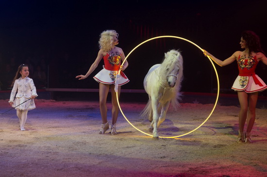 Das jüngste Mitglied der Familie Knie, die sechsjährige Marie-Chanel eröffnet in diesem Jahr den Reigen der Tierdressuren. Selbständig und gekonnt lässt sie ein schneeweißes Pony durch vier große, per LED-Technik beleuchtete Metallringe laufen.